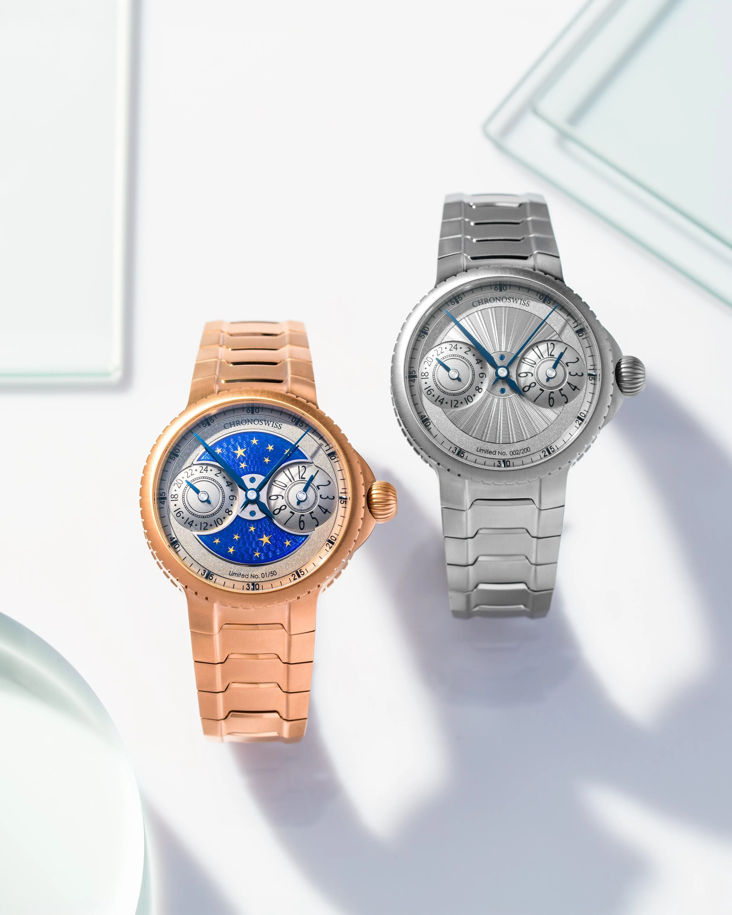Time moves differently when you cross borders. Cities change, time zones shift, and every hour tells a different story. With the new PULSE GMT, Chronoswiss presents two modern mechanical companions for those who move between worlds. Inspired by the unconventional dual-time display of the Chronoswiss Tora from 1999, the PULSE GMT translates this spirit into the bold architecture of the PULSE family. A sculptural case, the first seamlessly integrated bracelet in Chronoswiss history and a true GMT construction make these timepieces unmistakably modern.